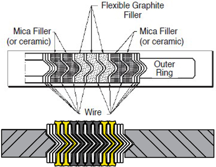 Configuration:Spiral wound wires, available in most commercially available metals. Rings of any standard metal.Usually,the mica(ceramic) layer is filled in the inner or outer layers(see the dawing),and the graphite layer is in the middle.As we know,the working temperature of the graphite in the air is just 550