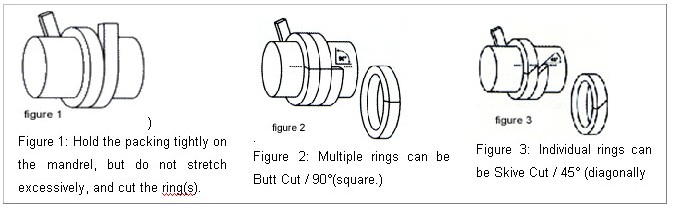 The best way to cut packing rings is to cut them on the mandrel with the same diameter as the shaft in the stuffing box. If there is no wear, rings can be cut on the shaft outside the stuffing box.Insert one ring at a time into the stuffing box, making certain it fits the packing space properly. Each additional ring can be cut in the same manner, or the first ring can be used as a master from which the balance of the rings are cut.If the Butt Cut rings are cut on a flat surface, be certain that the side of the master rings, and not the I.D. or O.D. surface, is laid on the rings to be cut. This is necessary so that the end rings can be reproduced.When cutting Skive, diagonal joints, use a maple miter board so that each successive ring can be cut at the correct angle.