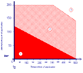 请注意以下图表所示仅作为指导,该参数引用时要根据垫片的厚度和具体操作条件。本参数参考厚度 2.0 mm,所有操作我温度和压力根据接触的化学介质而定。请查阅 KLINGER 公司的相关化学介质适用表或使用 KLINGERexpert 计算机设计软件。